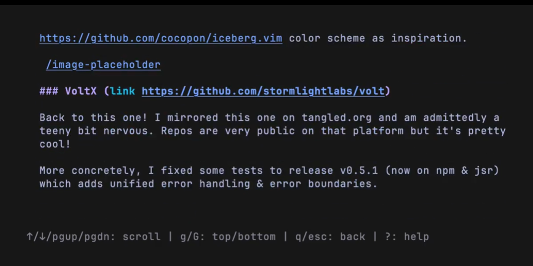 Above is a little snippet of my Halloween log post rendered as markdown in the terminal. The feedback on this has been super positive so far! Screenshots and recordings are magical.