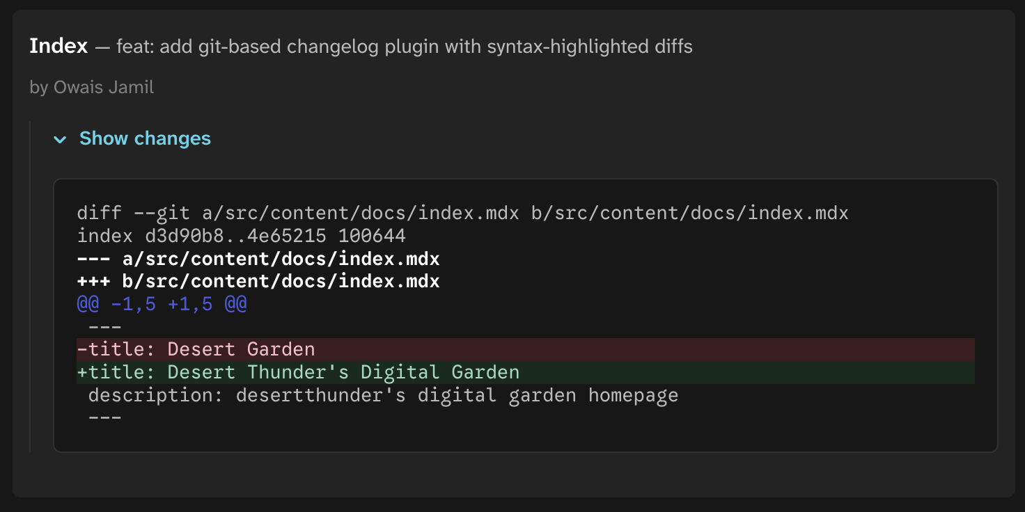 More Astro work yesterday. I'm working on a custom changelog/diff plugin that creates a page in a Starlight project that does the following things: