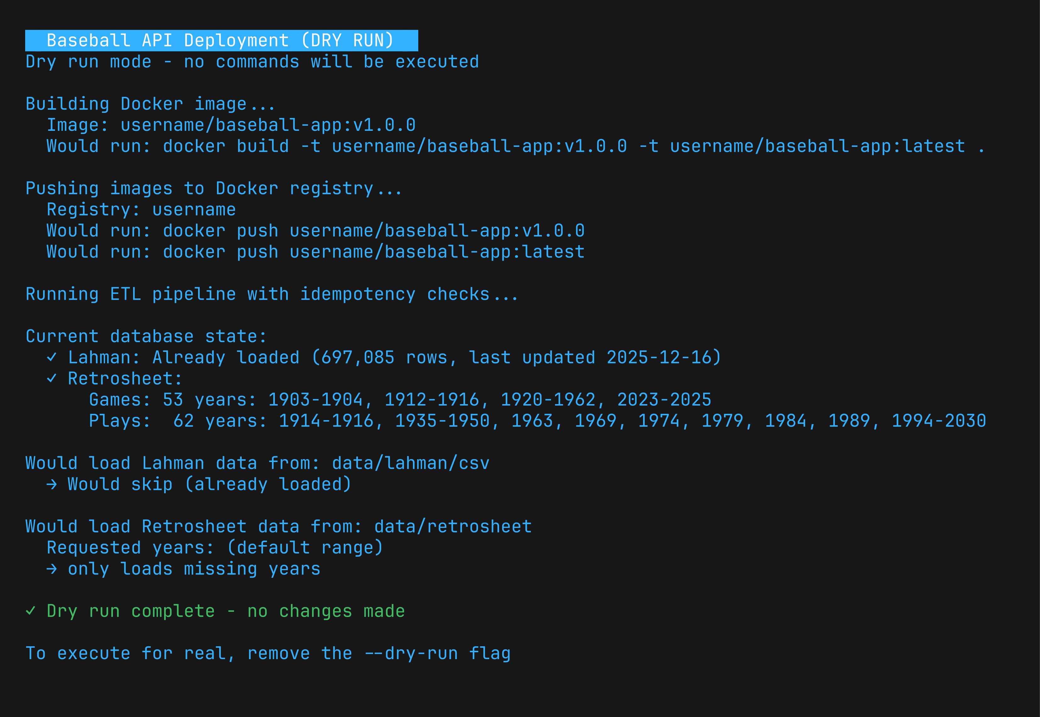Basically this involved peeking at the state of the database and invoking docker commands. I plan to host the image on dockerhub since the project is entirely open source. This is what the deployment output looks like! It's all behind the CLI.